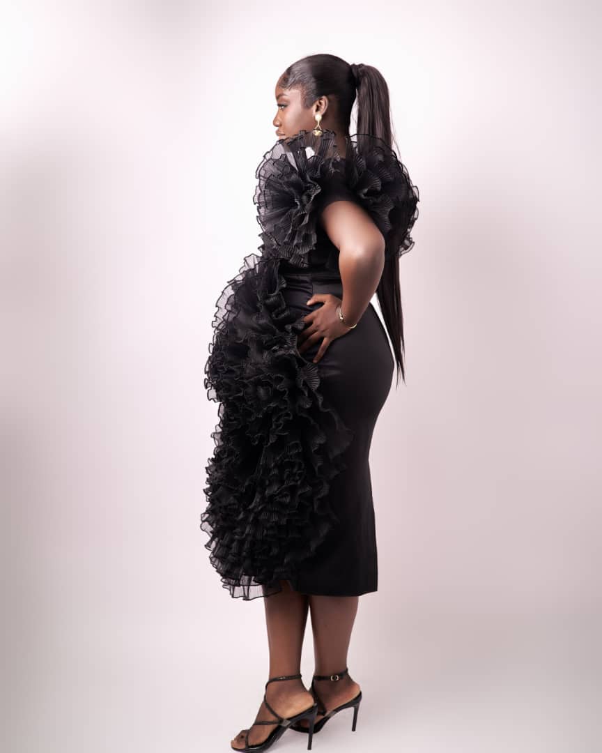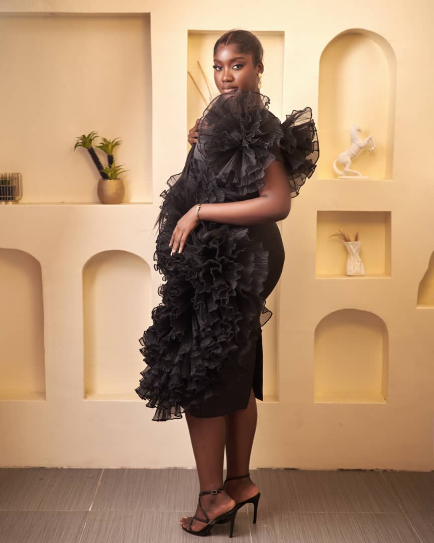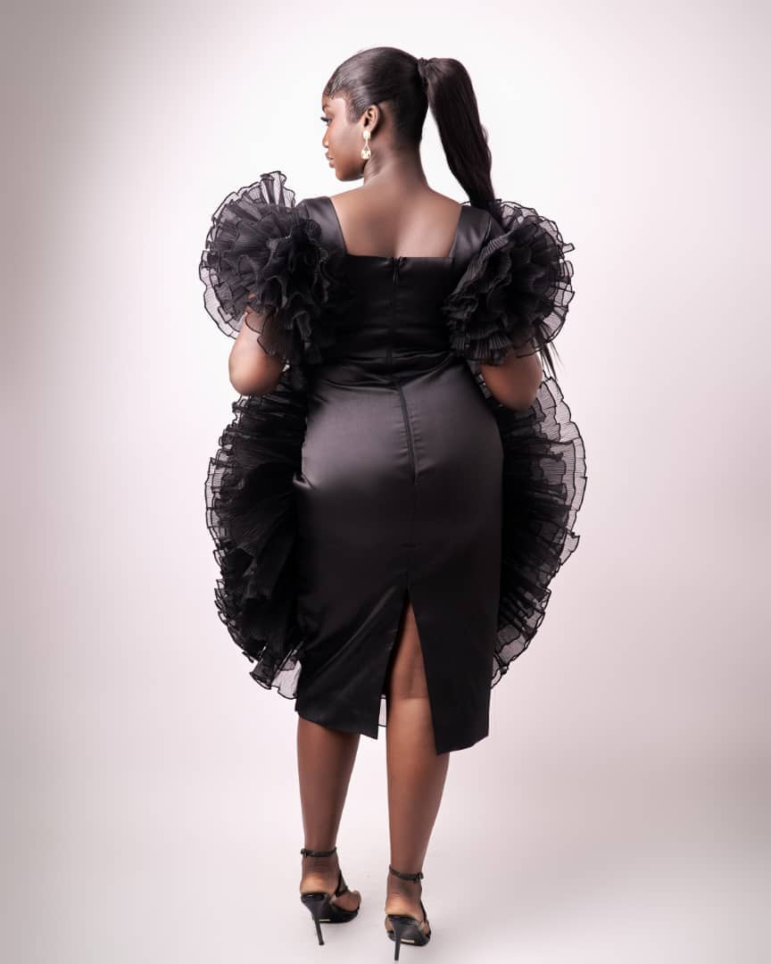 The pleated organza hem adds volume and soft drama, while the rosette detail enhances its couture-inspired aesthetic.