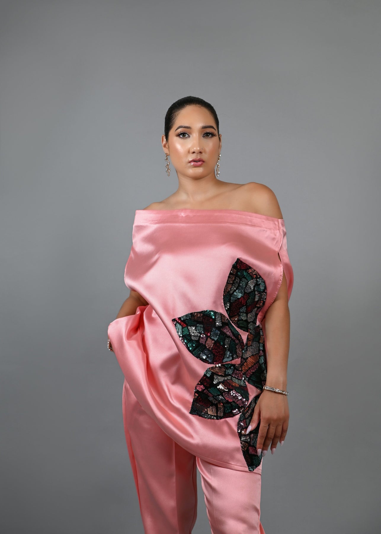 The Goddess pant set is an off shoulder top and pants with multicolored sequin on the sides to form beautiful petals. It is perfect for special occasions.