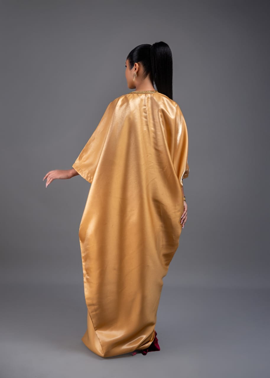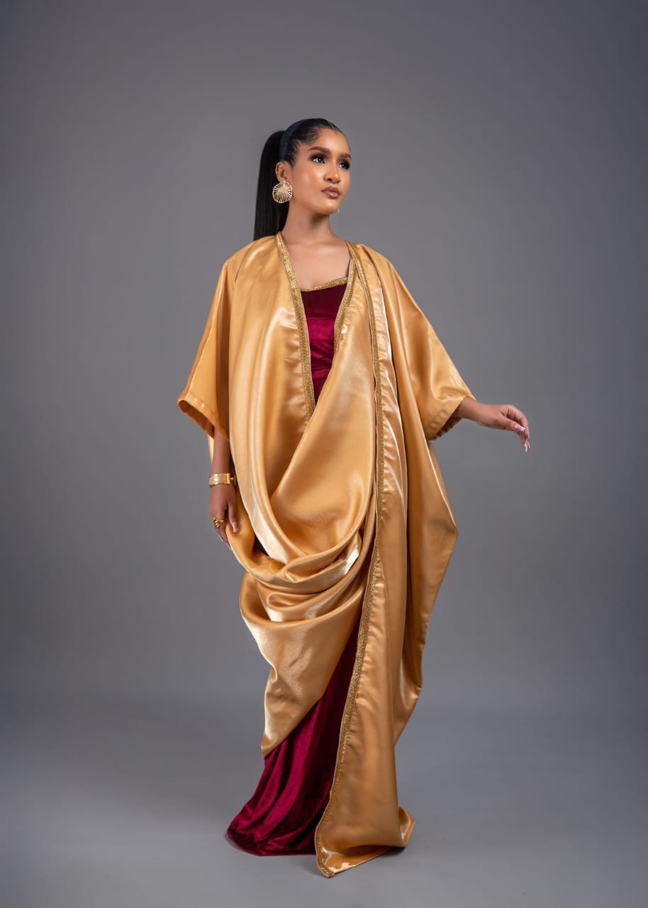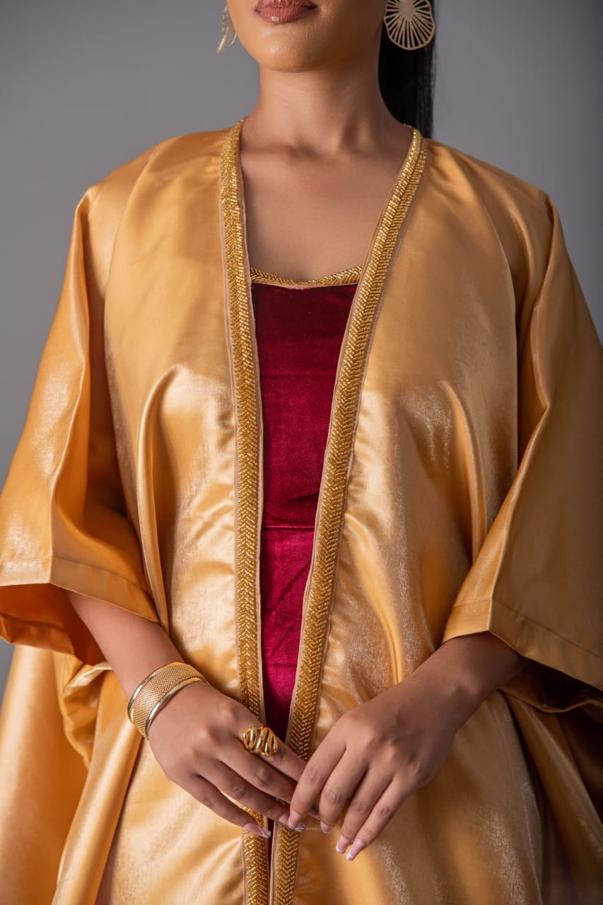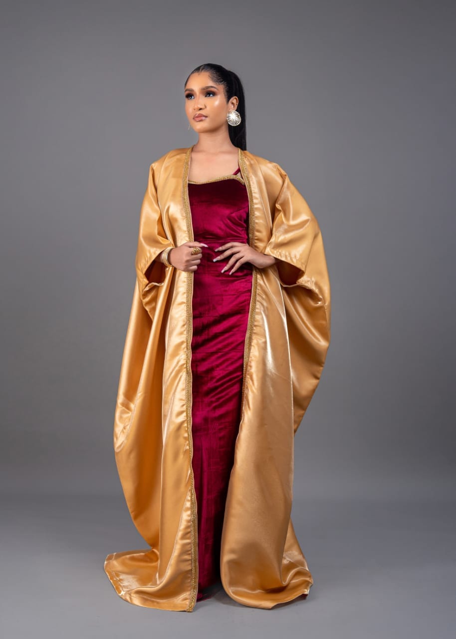 Take your style to the next level with our Wave Set which is a 2-piece outfit: an embellished tube velvet red dress, gold kimono with gold embellishment  to give ultra extra luxury.