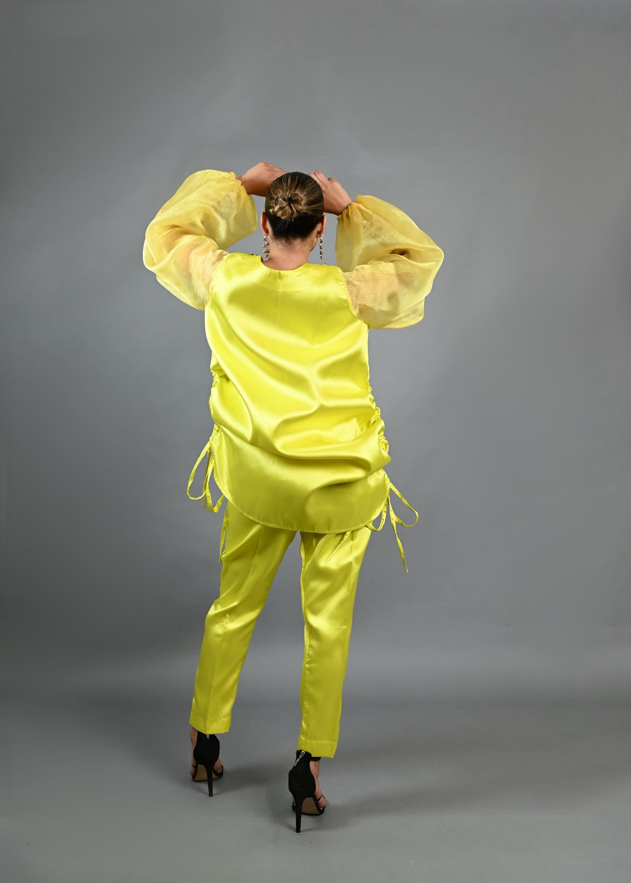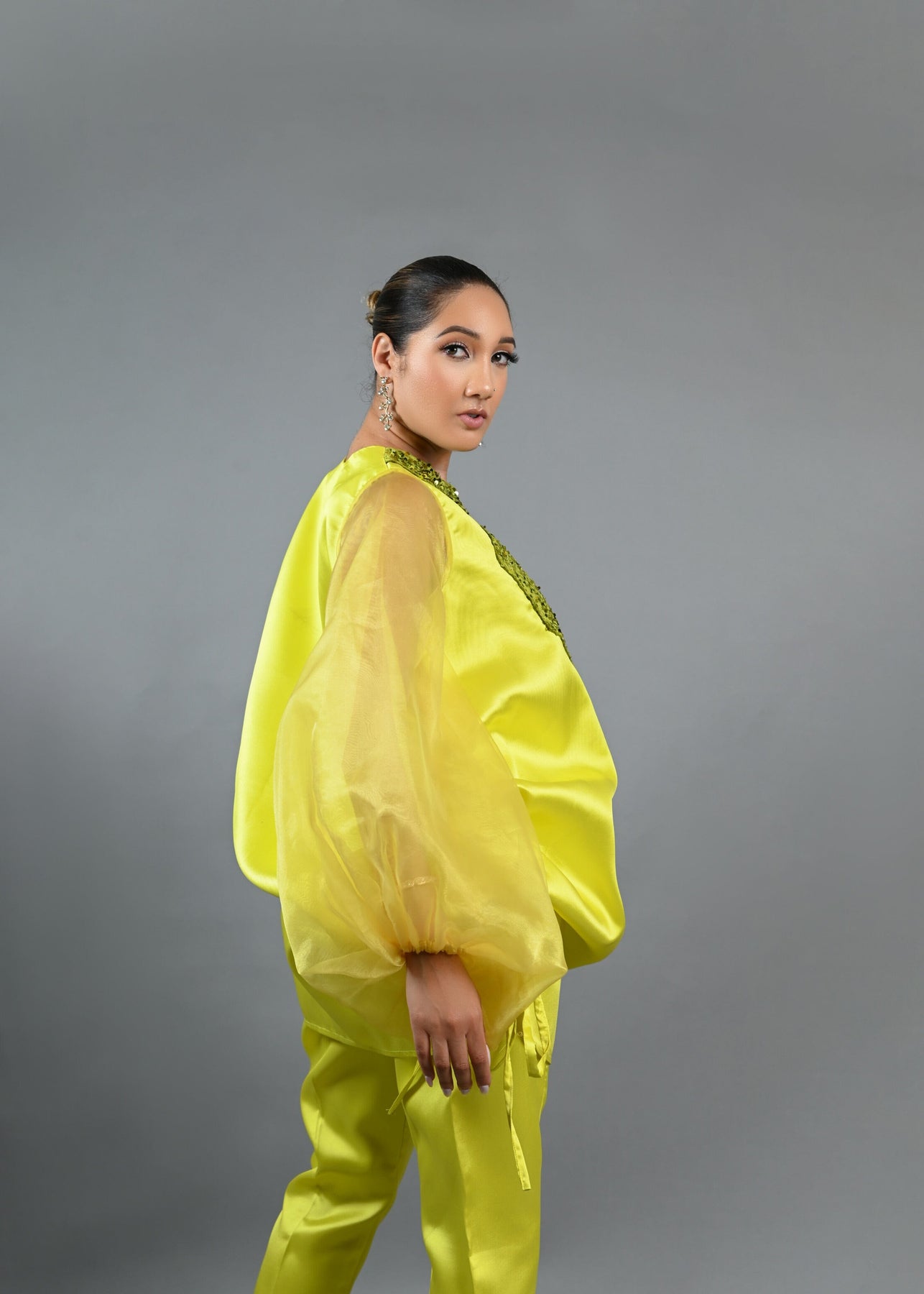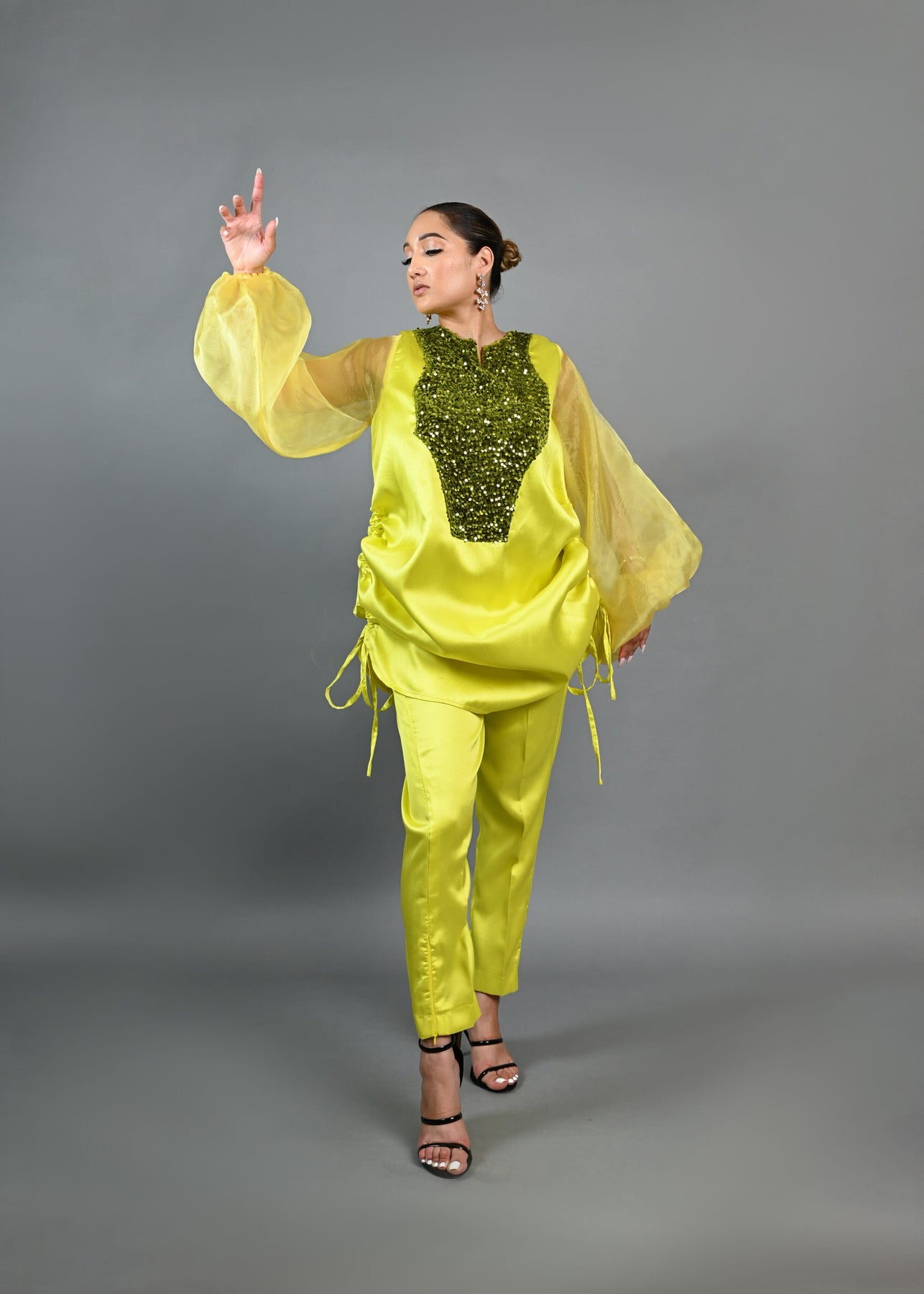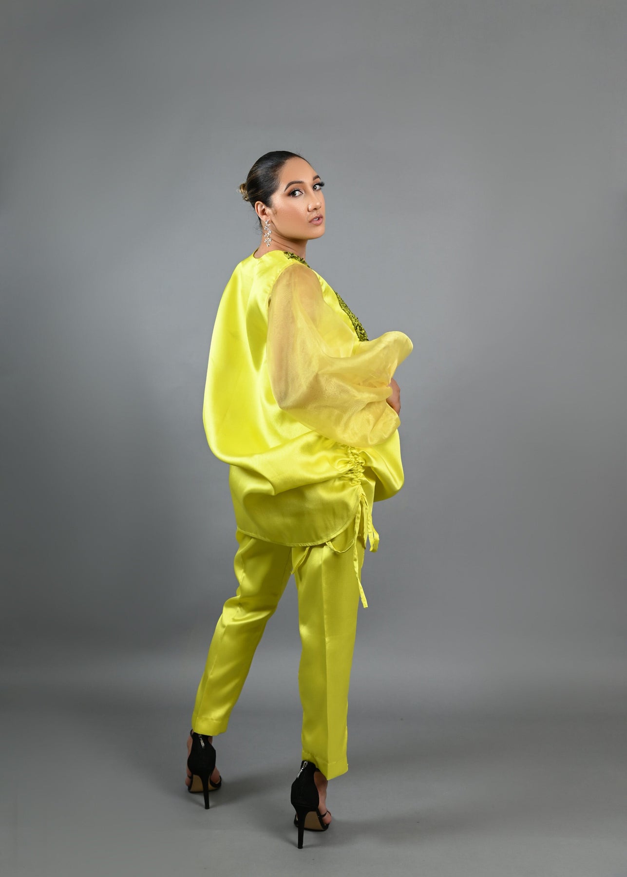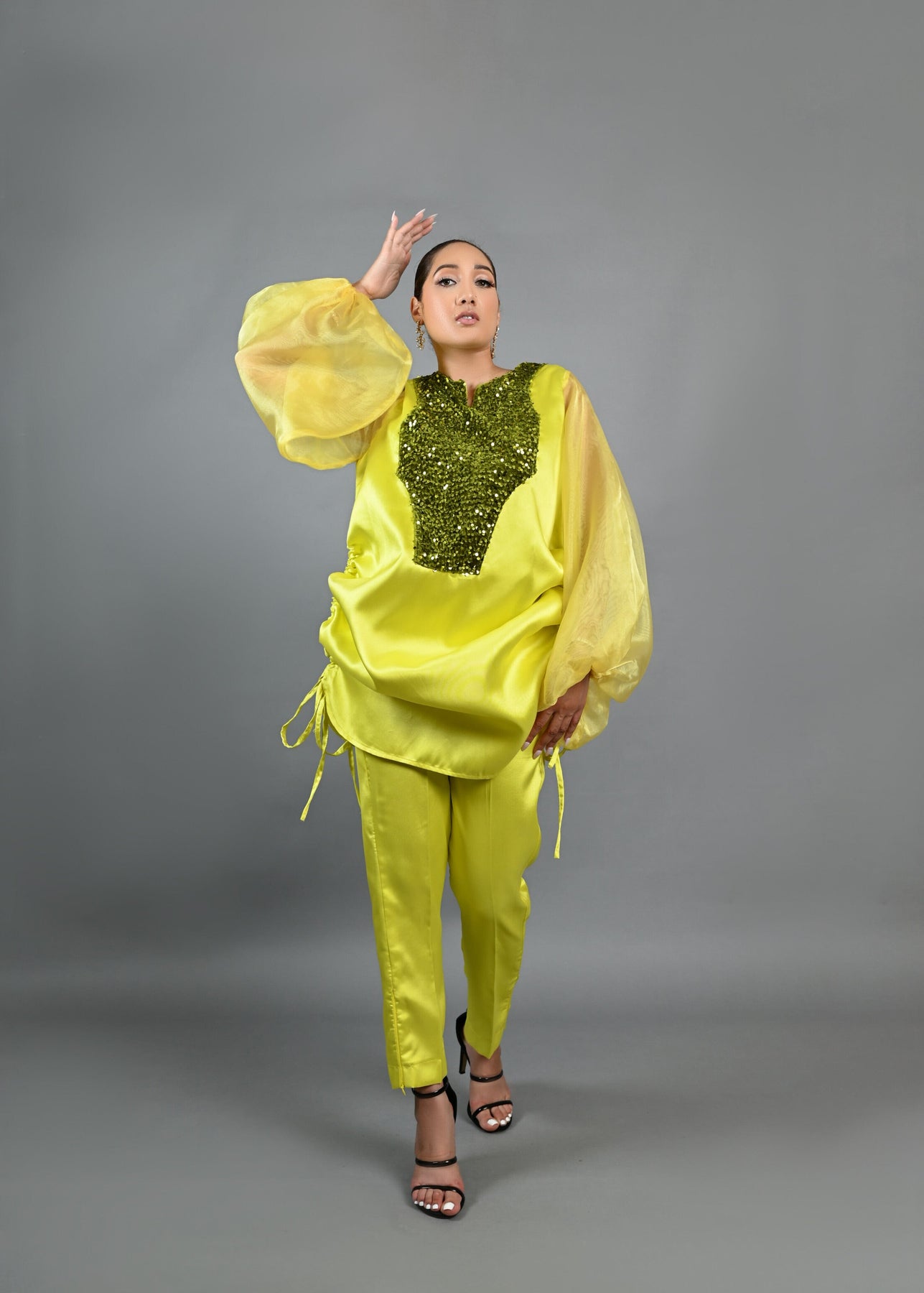The Boss Tunic pant set (Neon) with sequin detailing on the neck is a pencil cut pant and Tunic long top made with mikado silk fabric and long bubble sleeve. The gold sequin on the neck adds to the elegance of the outfit. The ropes on each size of the tunic can be tied or let loose to make the tunic top longer or shorter. The pant set can be worn as coordinates or as separates.