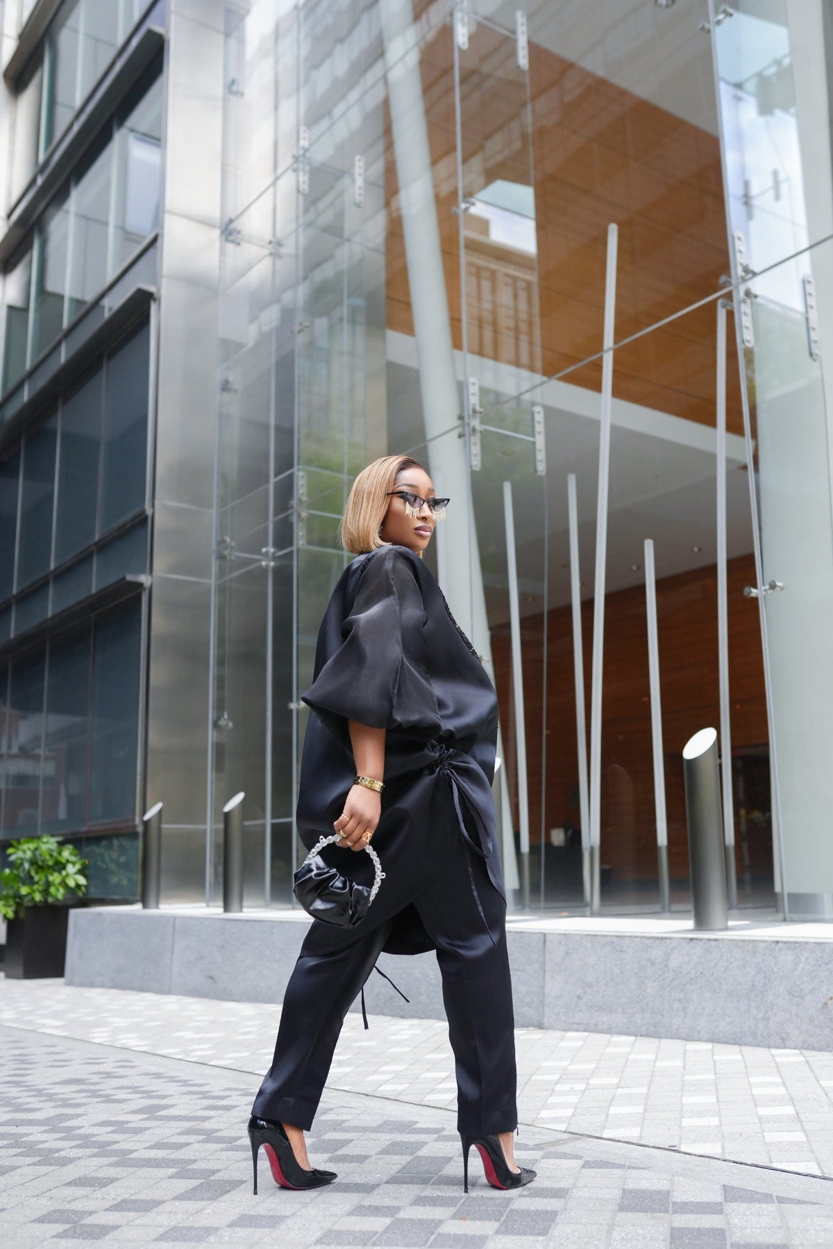 The Boss Tunic pant set (Black) with sequin detailing on the neck is a pencil cut pant and Tunic long top made with mikado silk fabric and long bubble sleeve. The gold sequin on the neck adds to the elegance of the outfit. The ropes on each size of the tunic can be tied or let loose to make the tunic top longer or shorter. The pant set can be worn as coordinates or as separates.