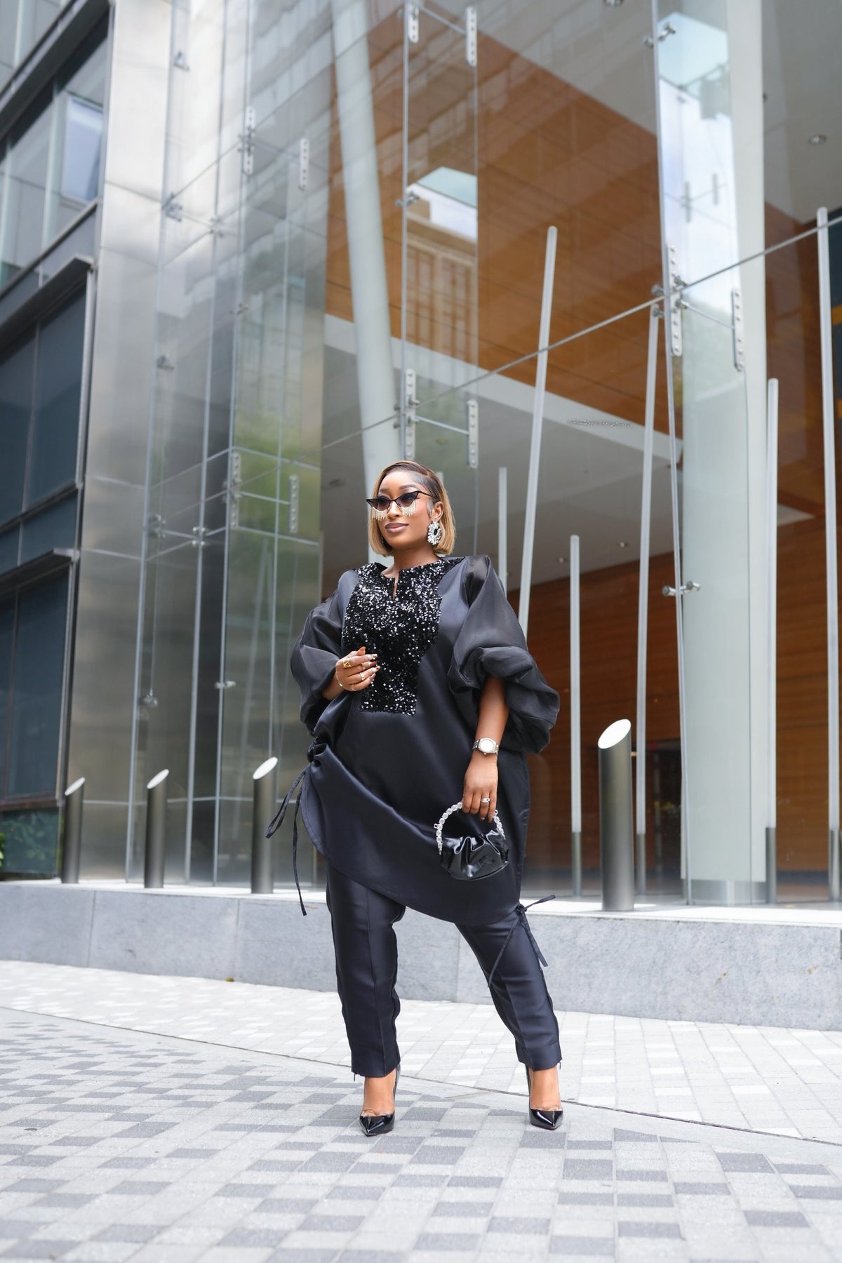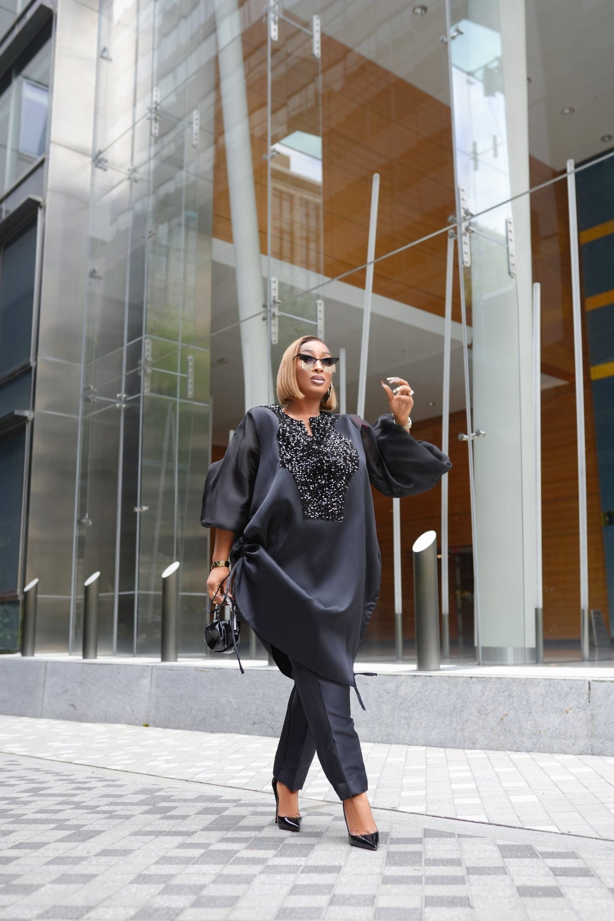 Boss Tunic Top and Pant set with sequin and bubble sleeves (Black)