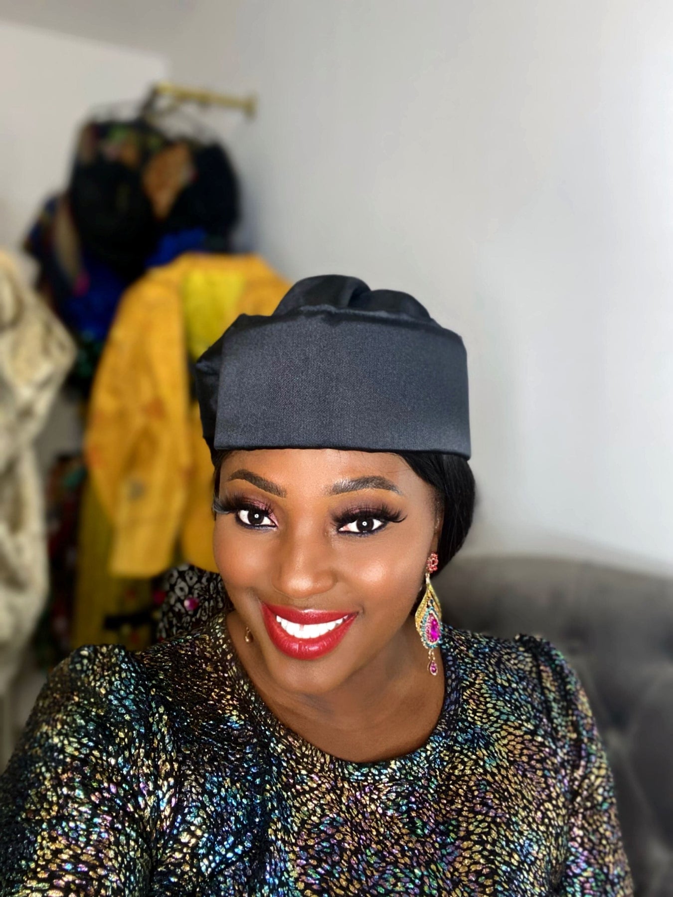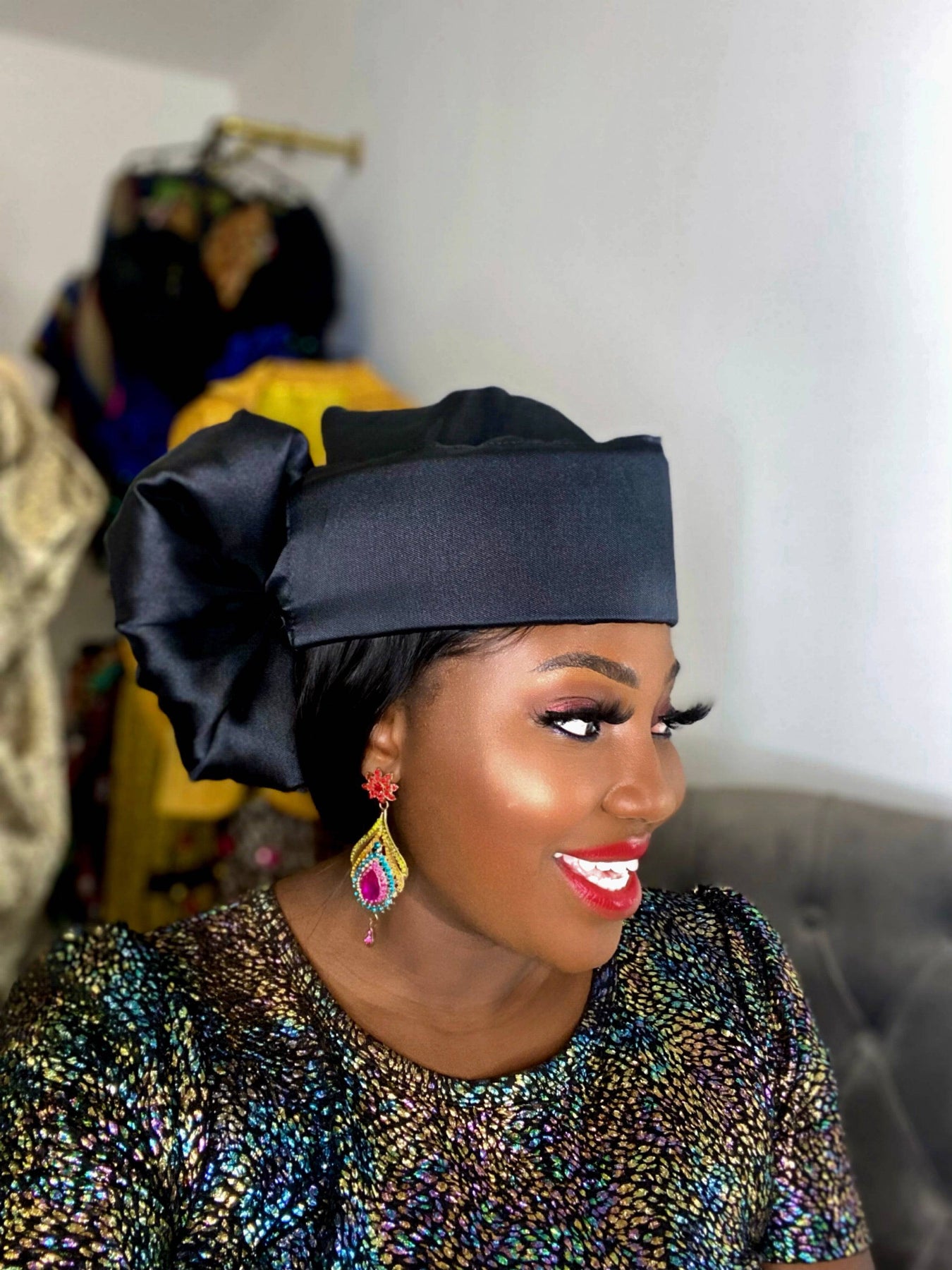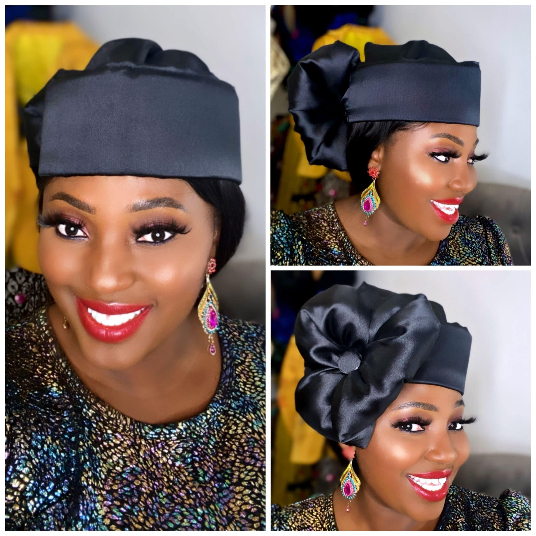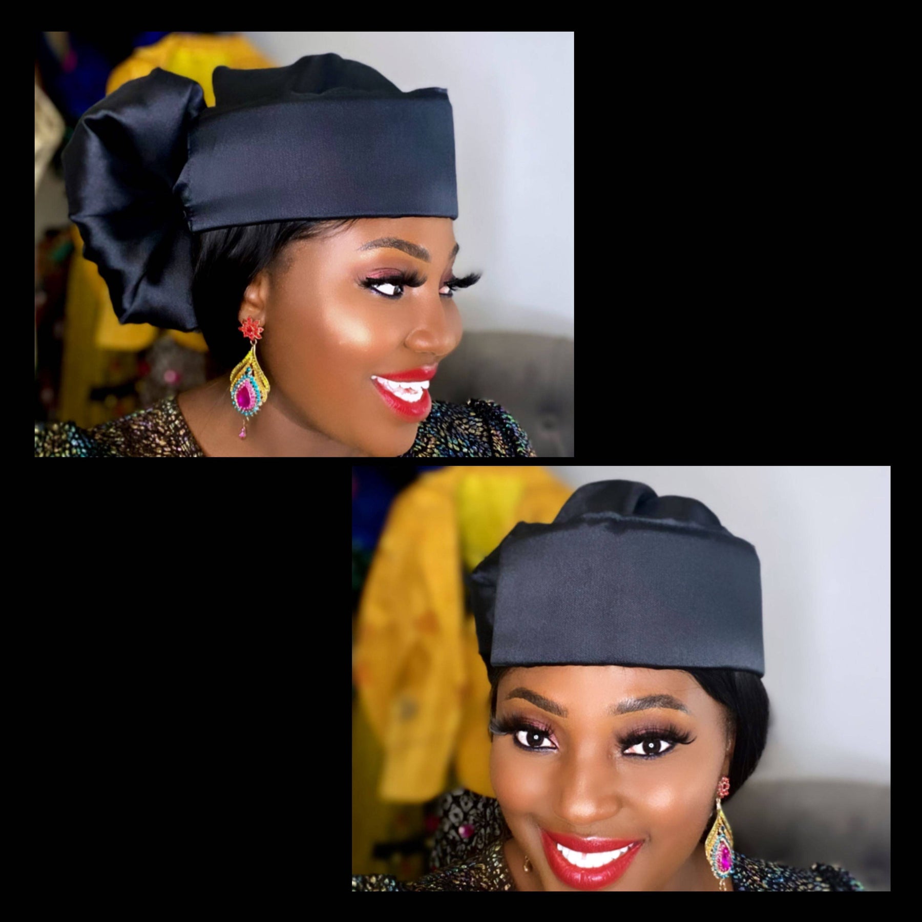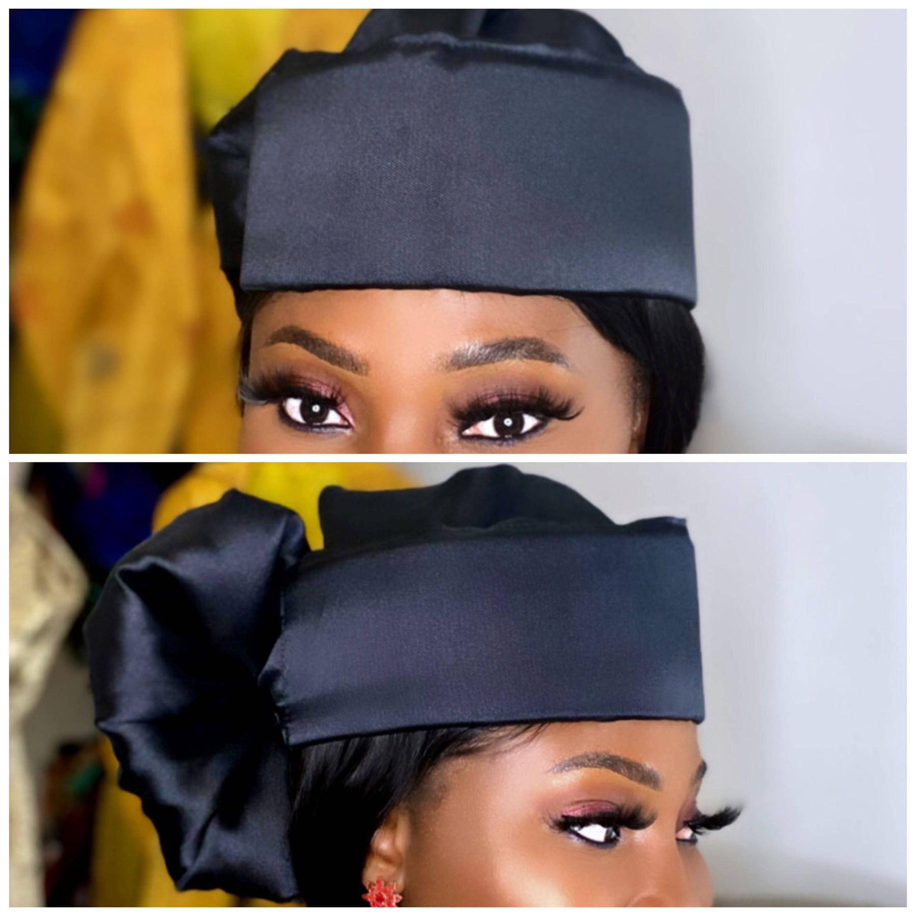 The turban cap has a fixed padded bow at the back, The cap can be worn either to the front, side or back.