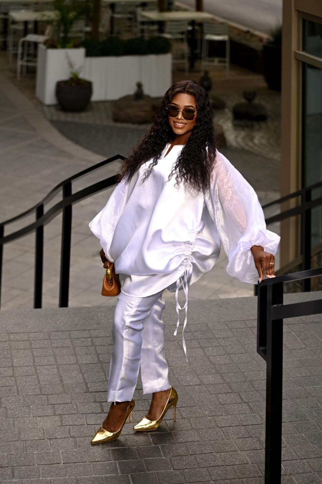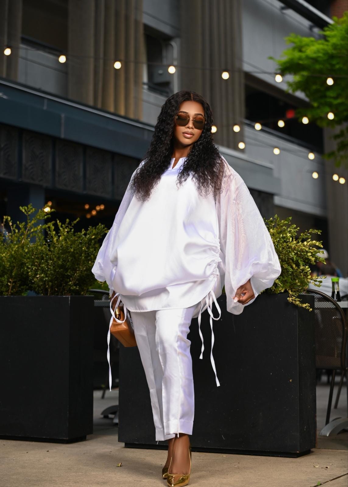 The Boss Tunic pant set (white) is a pencil cut pant and Tunic long top made with mikado silk fabric and long bubble sleeve. The ropes on each size of the tunic can be tied or let loose to make the tunic top longer or shorter.