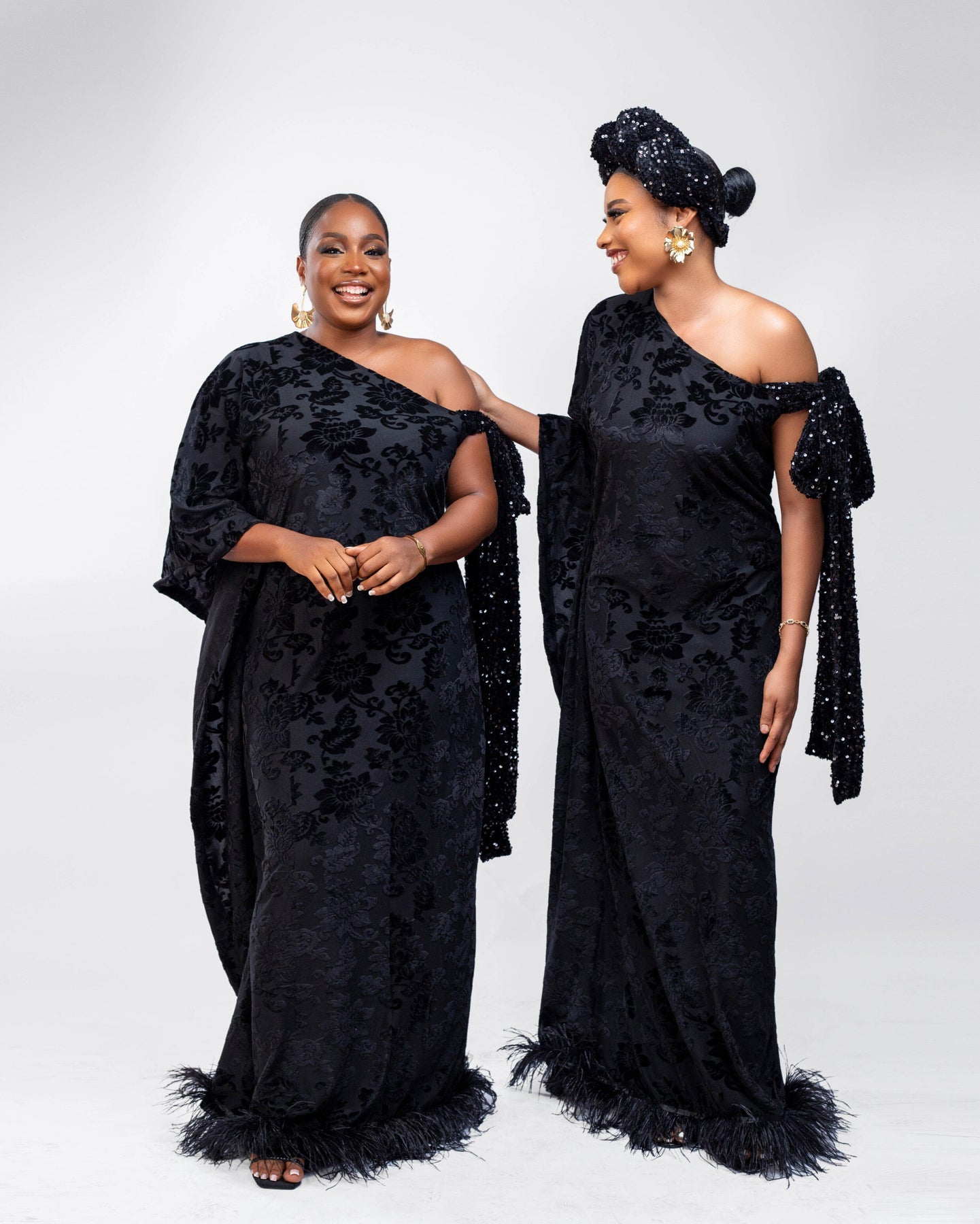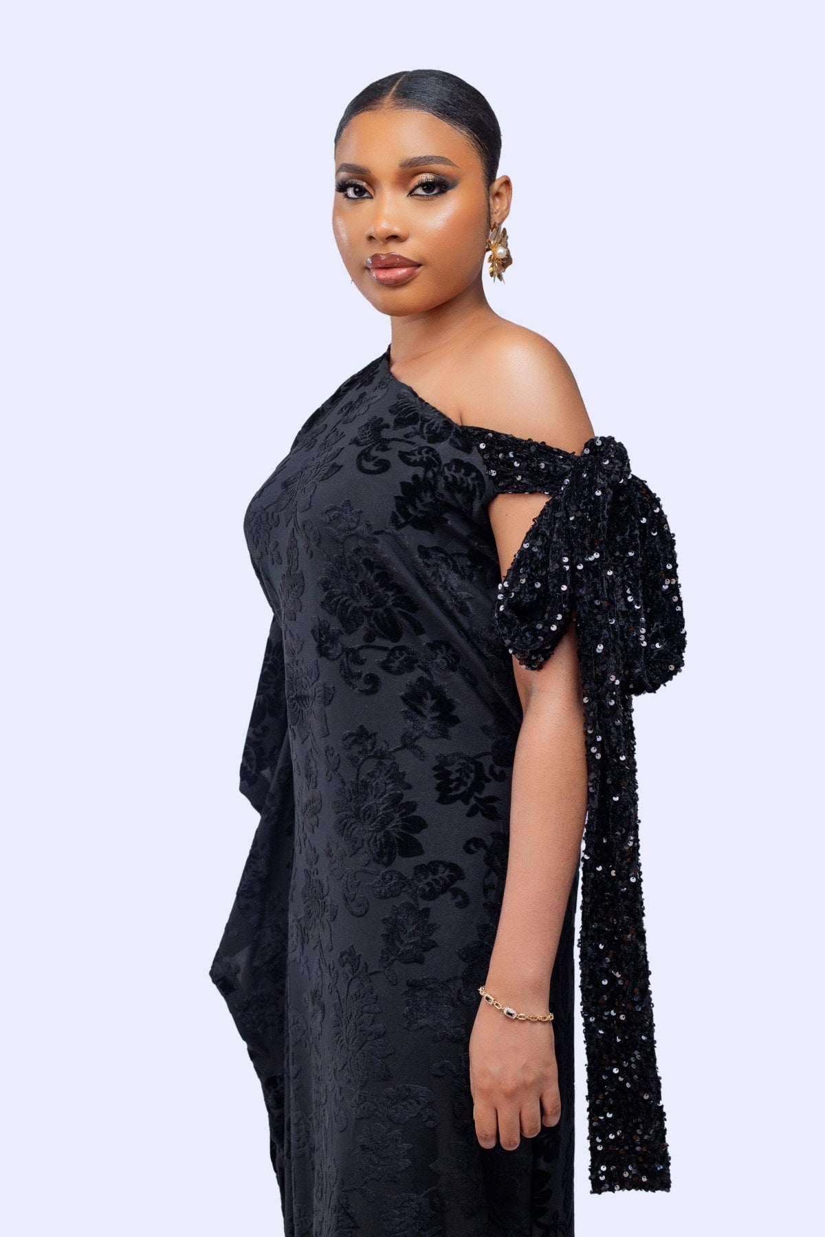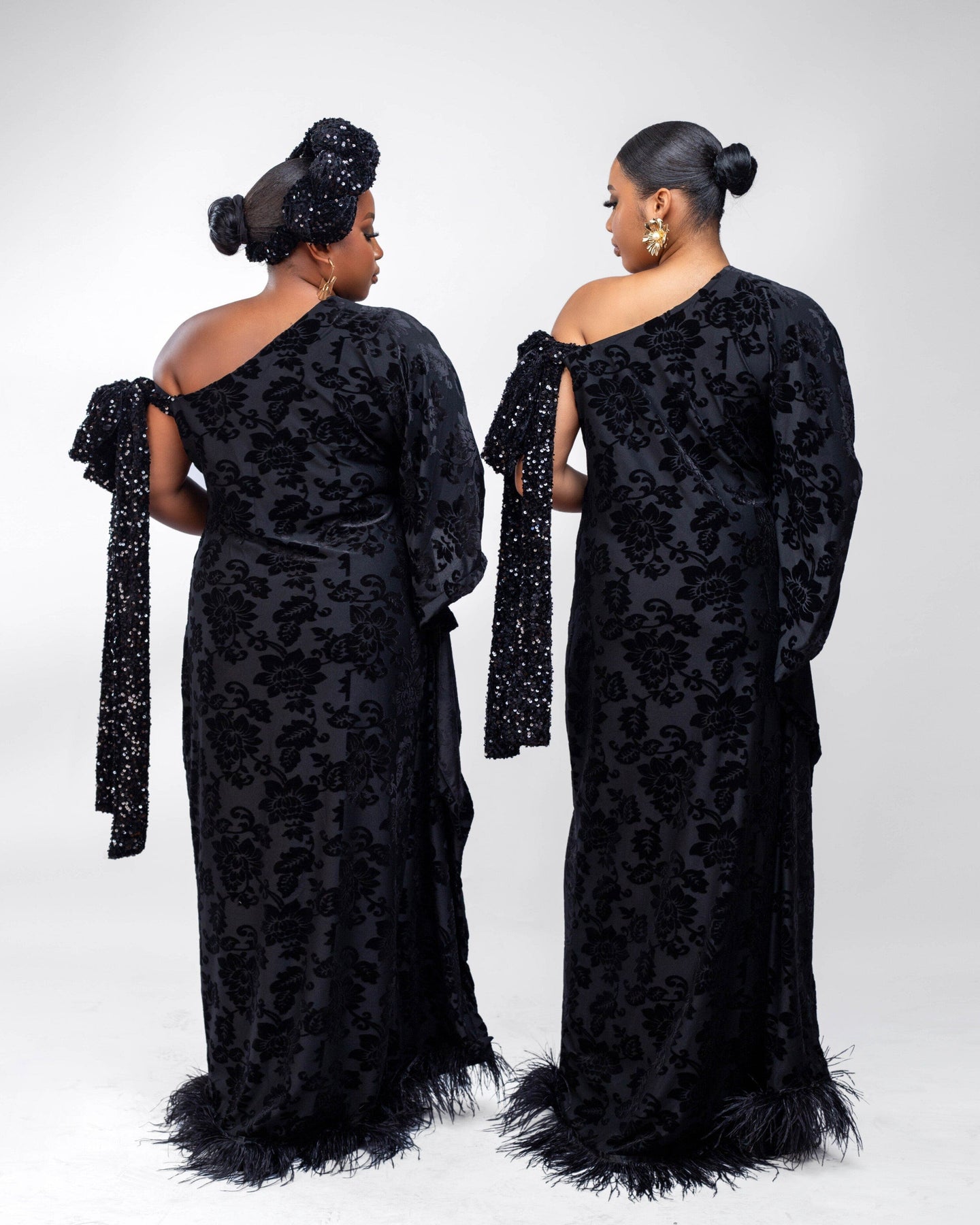 The Tyla assymetrical sleeves boubou dress is made with patterned velvet fabric and sequin ropes to tie.