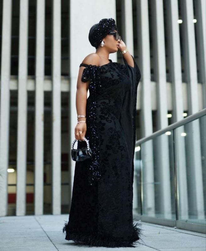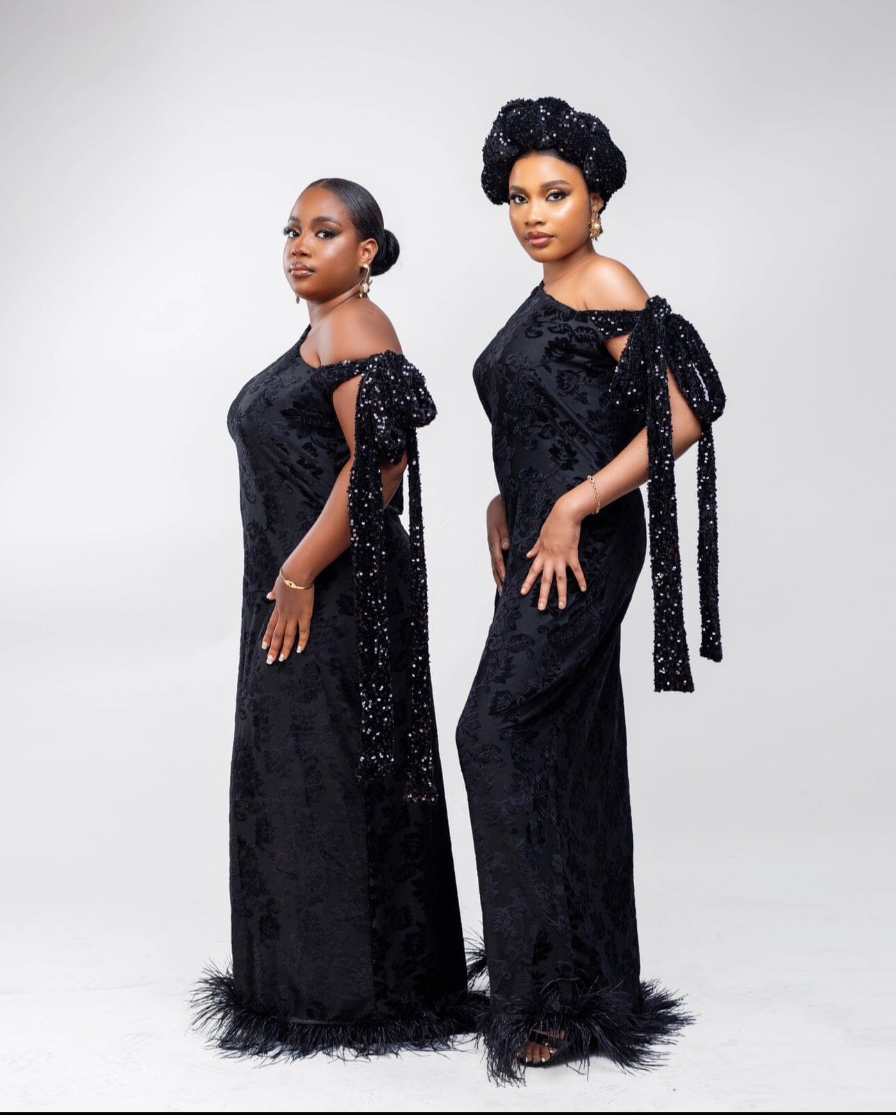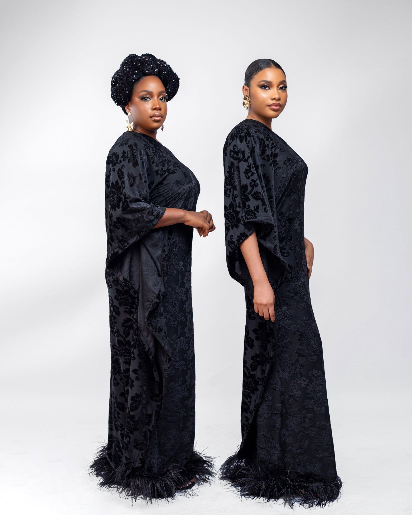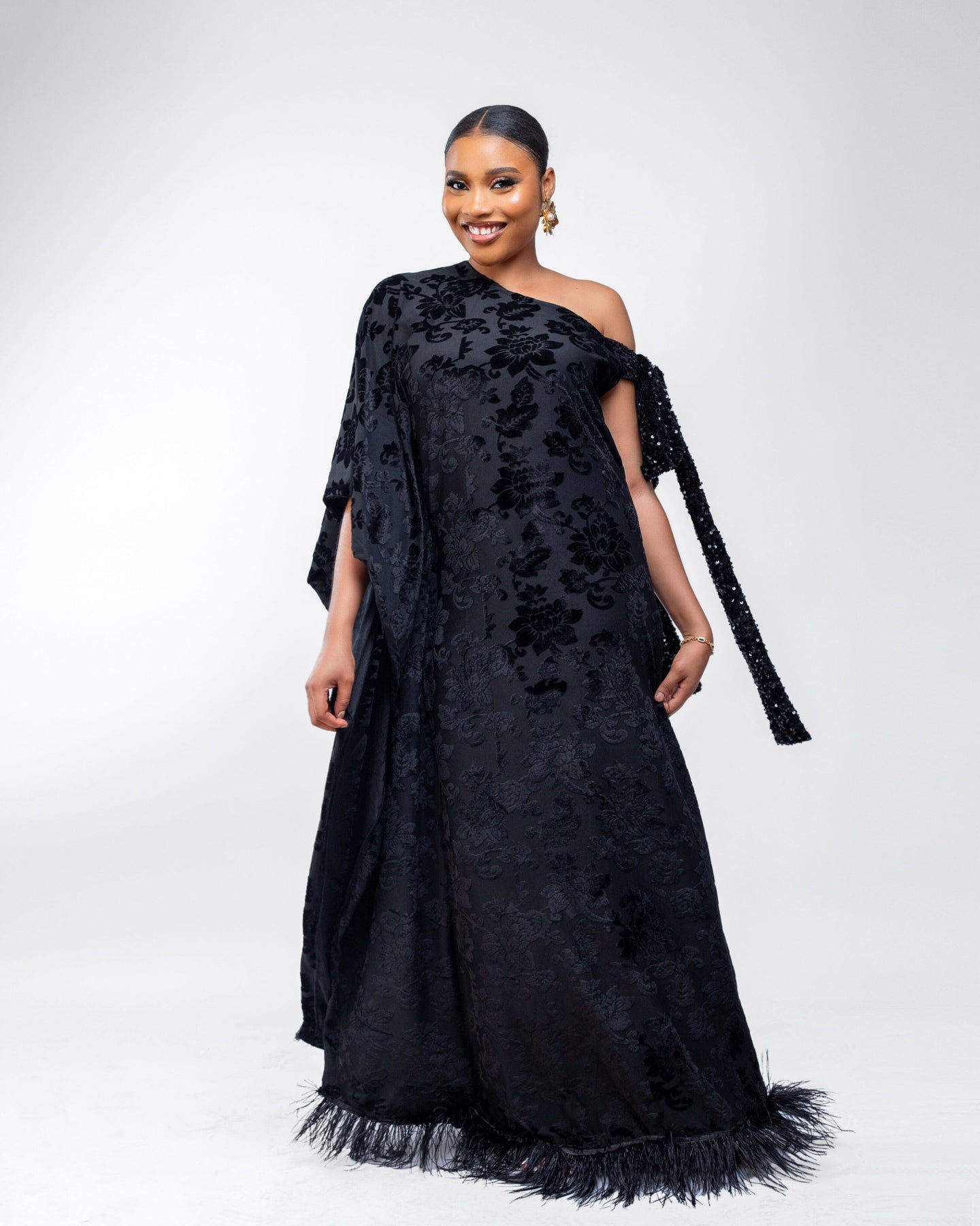 The Tyla assymetrical sleeves boubou dress is made with patterned velvet fabric and sequin ropes to tie.