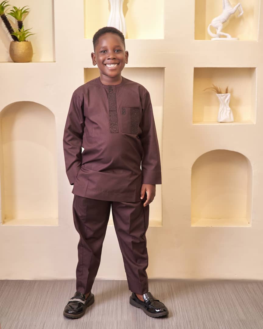 The Ruba Bibiré Kids Native Set brings refined elegance to the next generation. Crafted from premium wool fabric, this ensemble mirrors the sophistication of the adult version while ensuring comfort and ease for children. The long-sleeve top is delicately embellished with hand-applied stones that add a subtle, regal sparkle—finished with the iconic Bibiré logo rendered entirely in stones for a distinguished, signature touch.