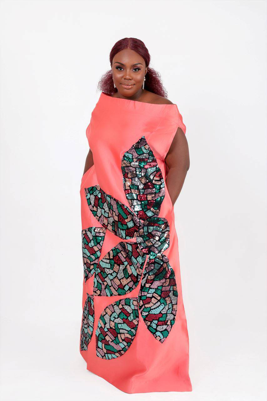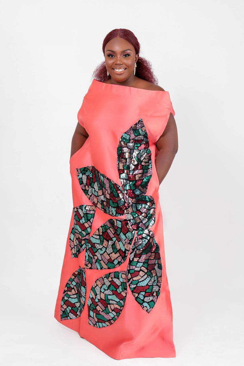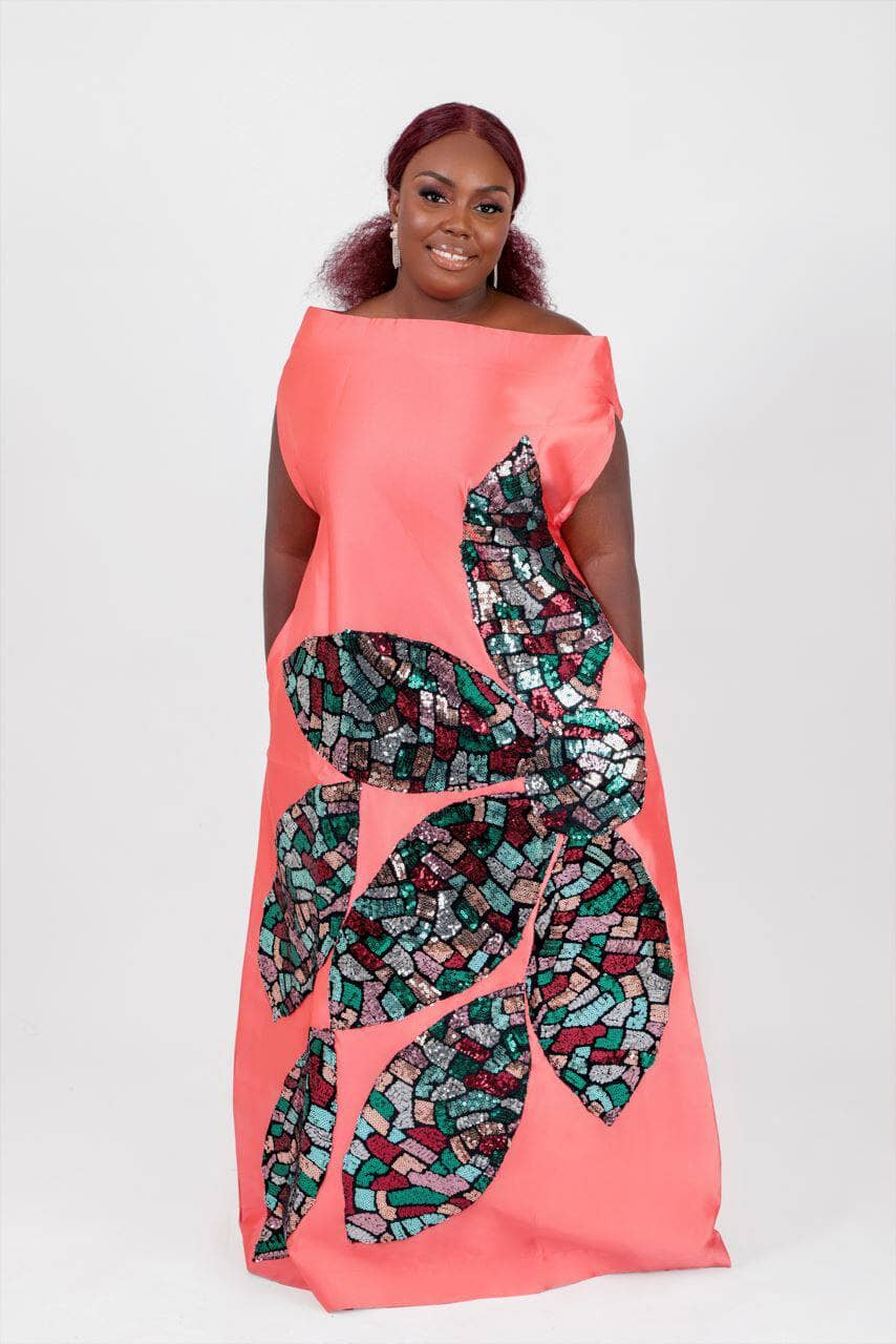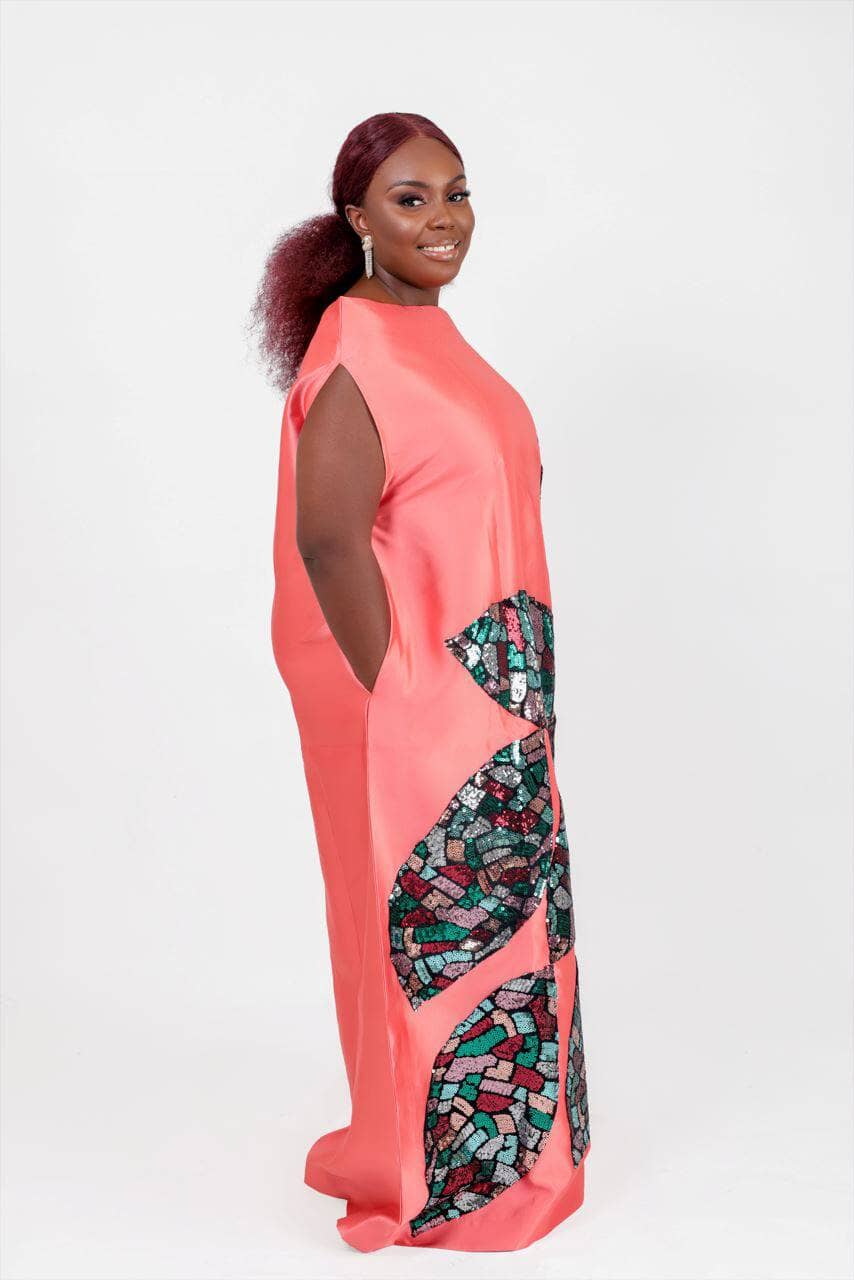Coral Goddess Boubou Dress - silk kaftan dress with sequin