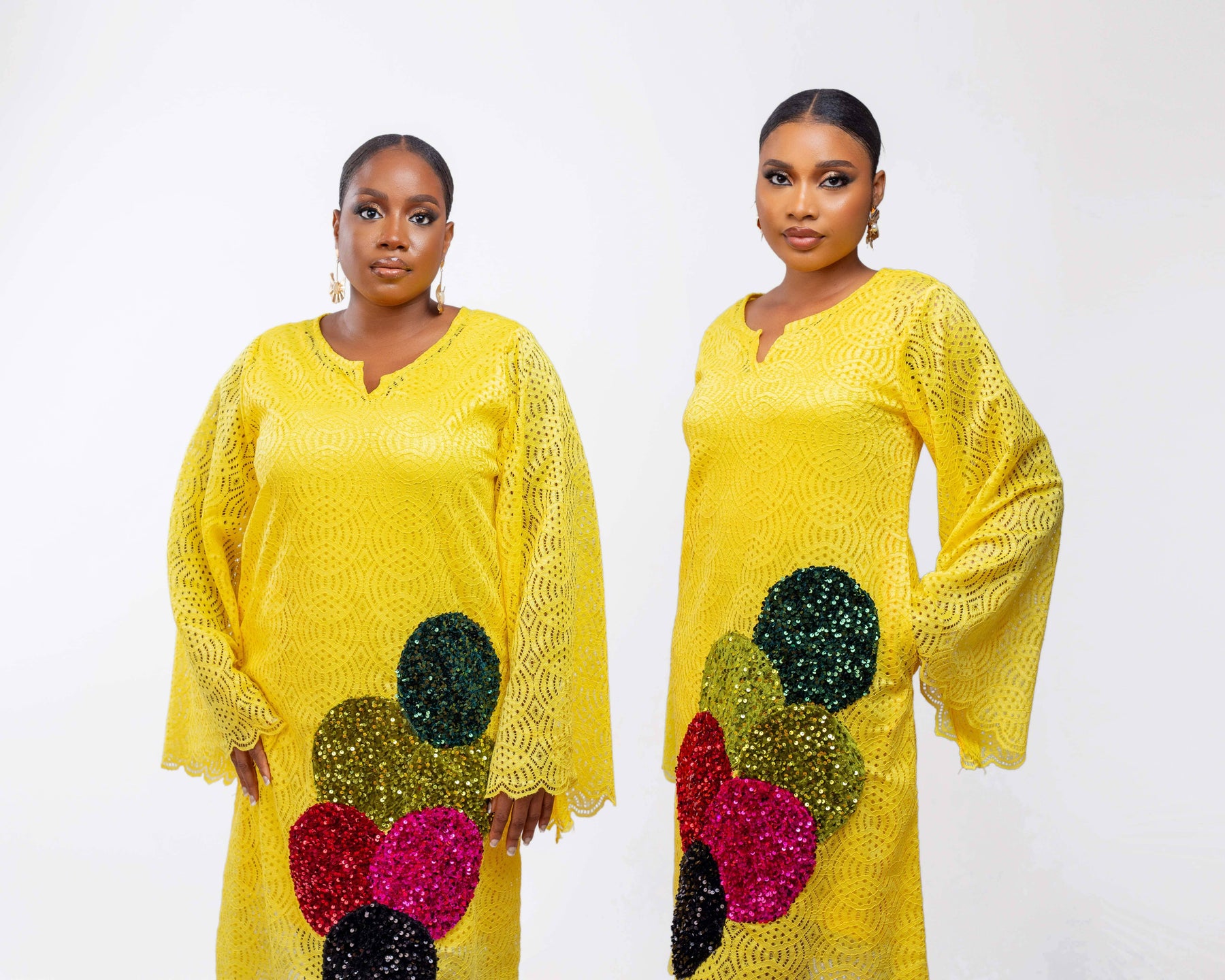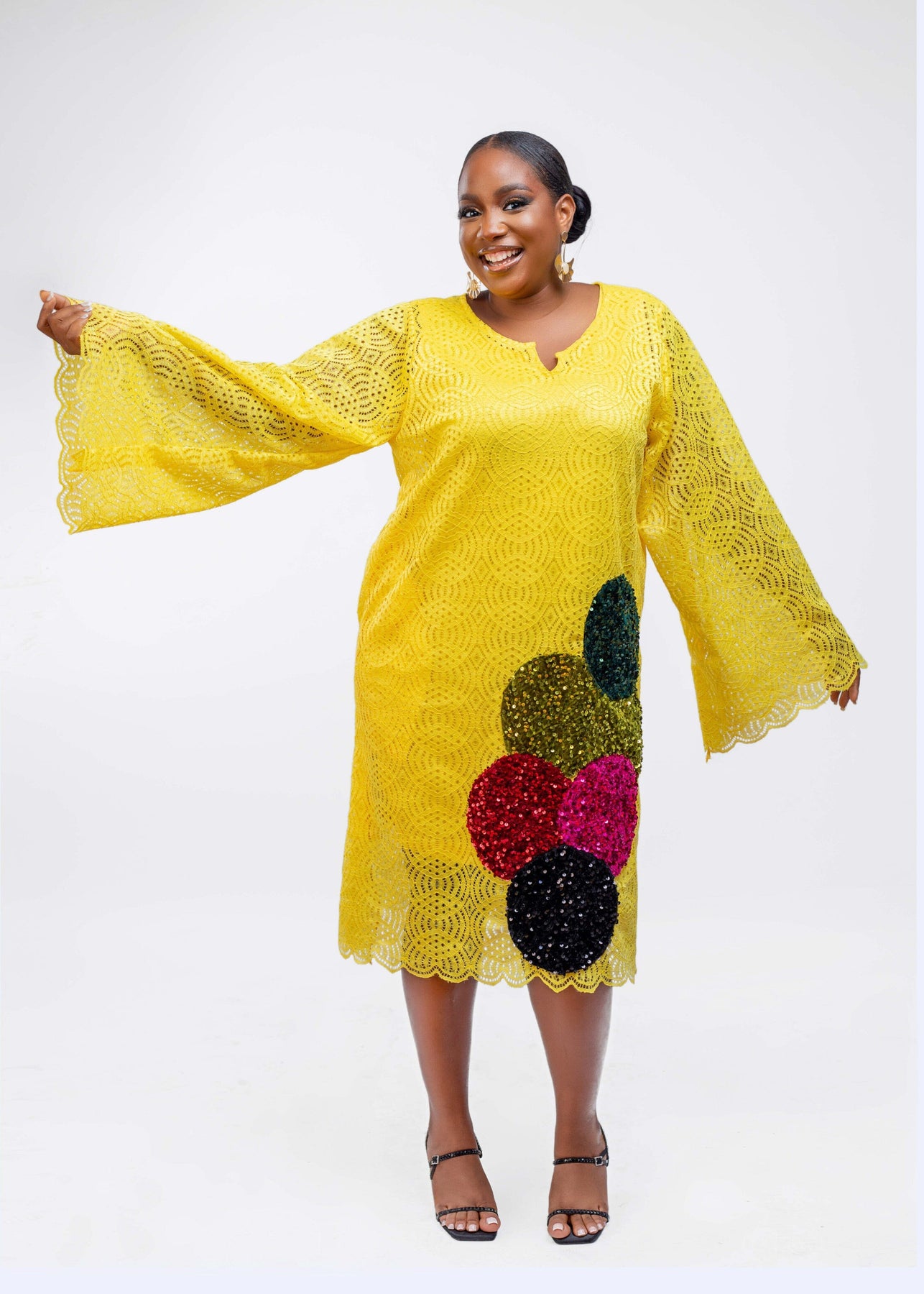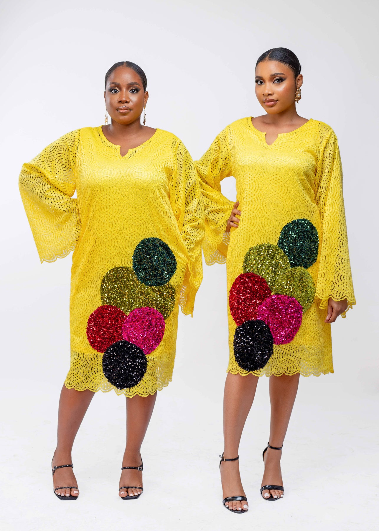 Simple but elegant Sunflower yellow short shift dress with circle multicolored sequin made with lace fabric. With this beautiful dress, you are bound to stand out.
