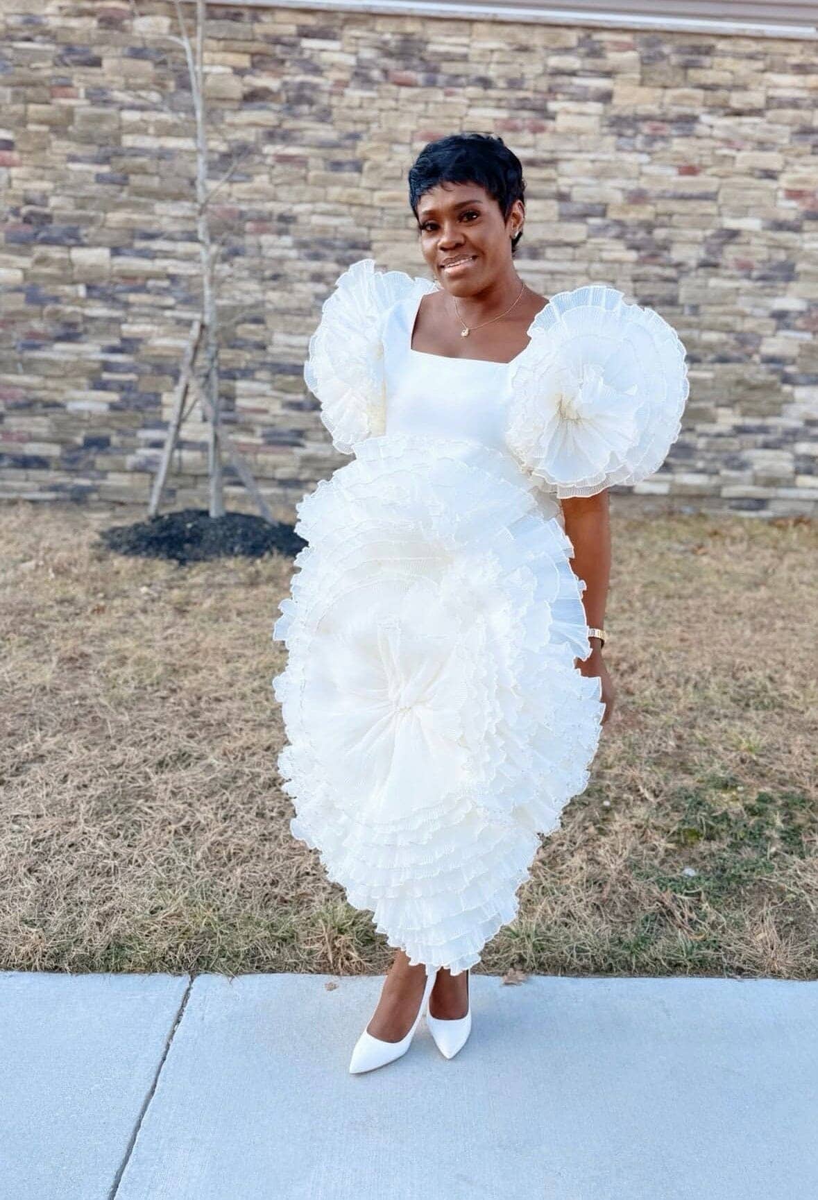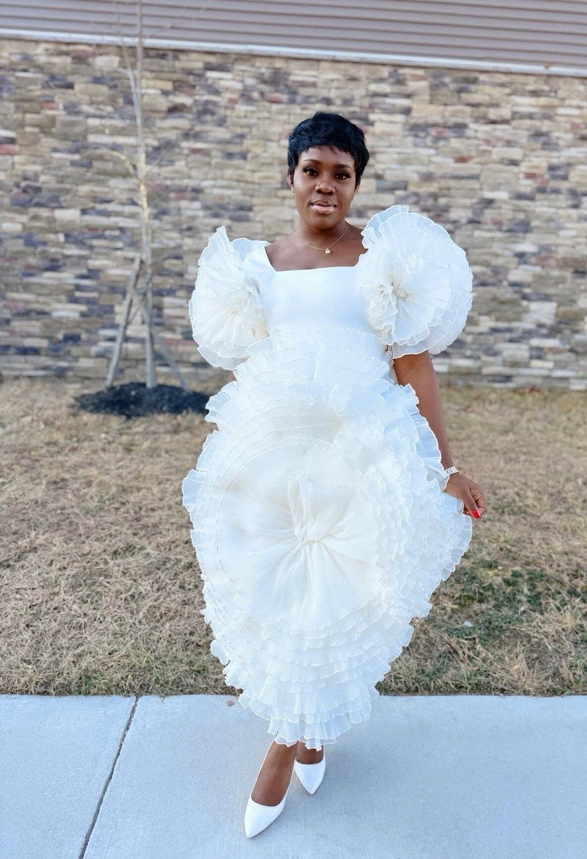 The pleated organza hem adds volume and soft drama, while the rosette detail enhances its couture-inspired aesthetic.