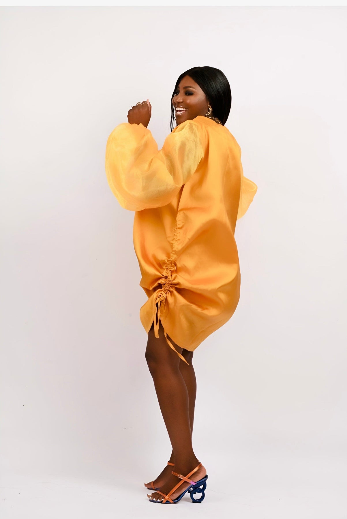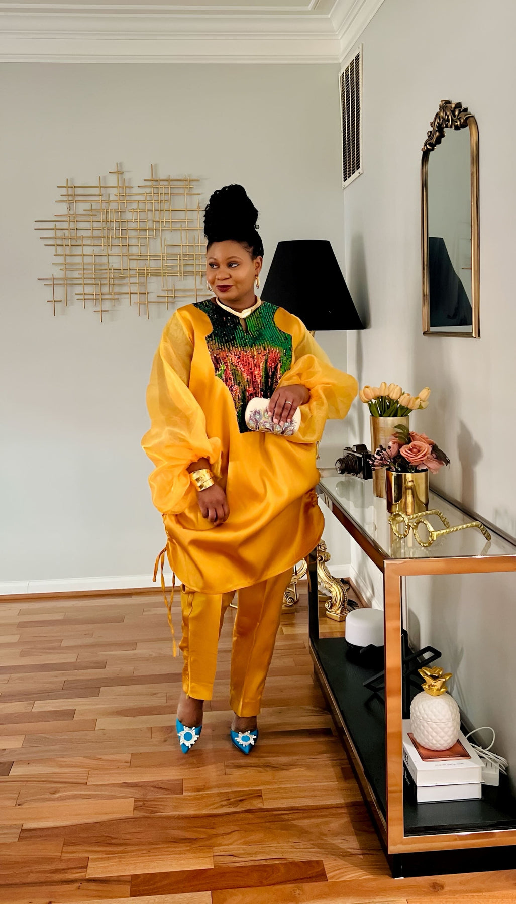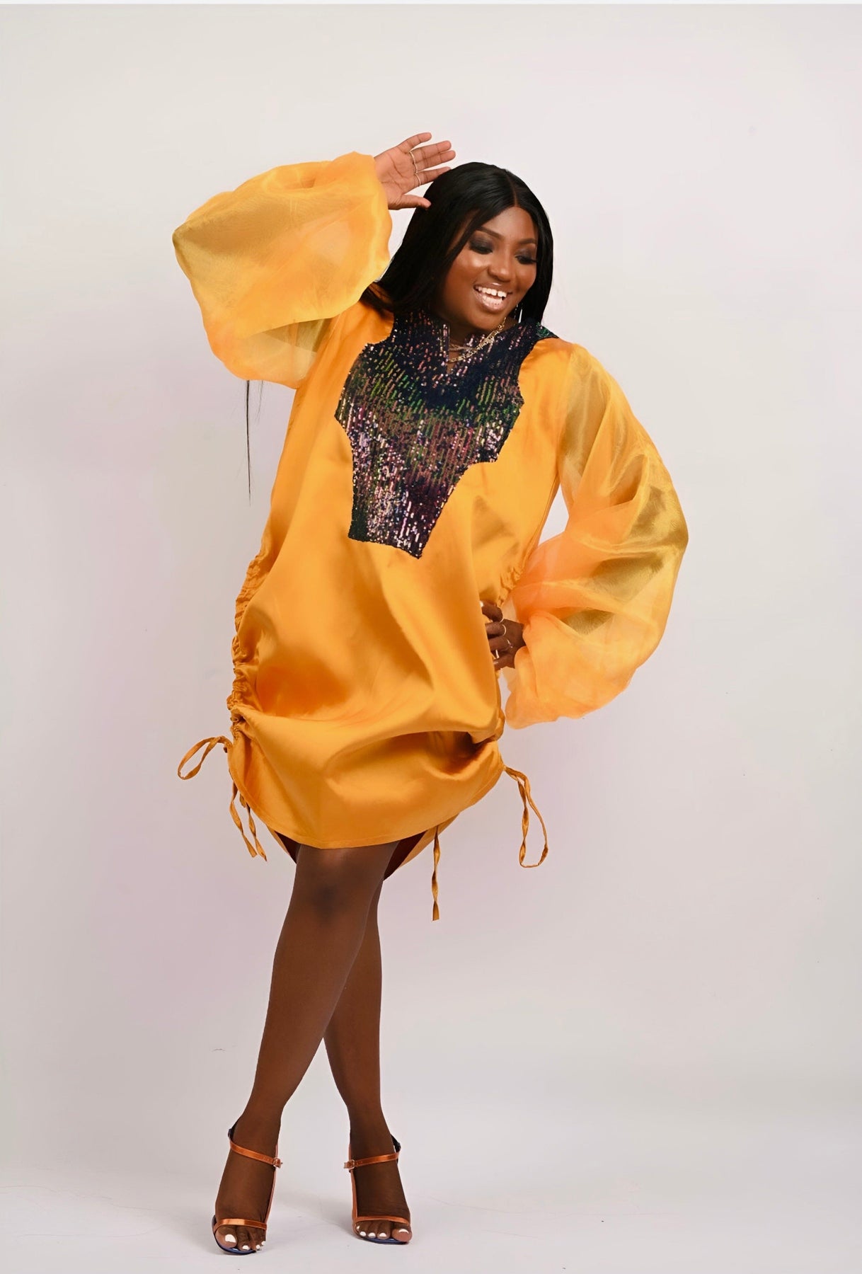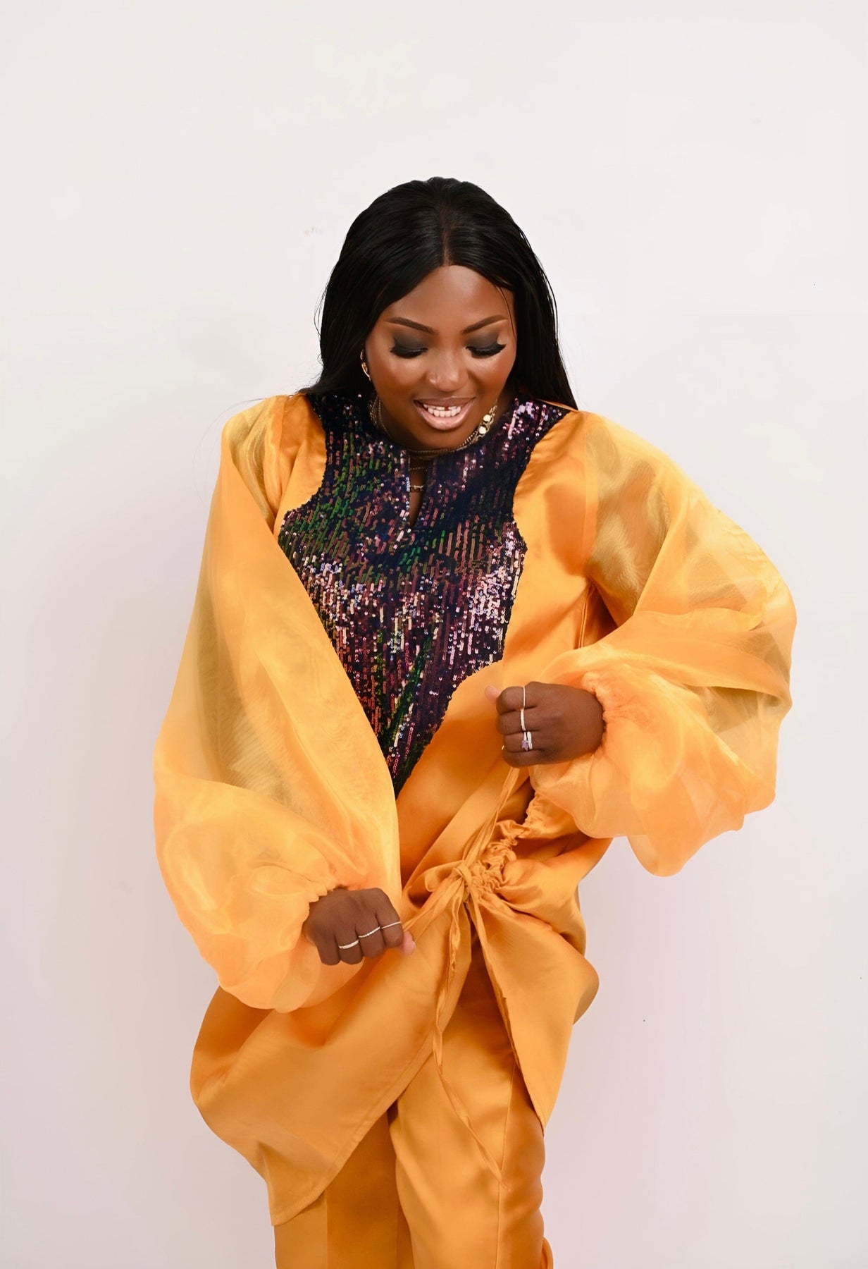 The Boss Tunic pant set (Burnt Gold) with sequin detailing on the neck is a pencil cut pant and Tunic long top made with mikado silk fabric and long bubble sleeve. The gold sequin on the neck adds to the elegance of the outfit. The ropes on each size of the tunic can be tied or let loose to make the tunic top longer or shorter. The pant set can be worn as coordinates or as separates.
