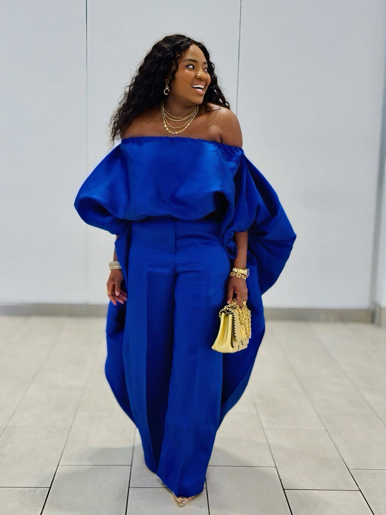 The high-low cut creates striking movement, while the bubble sleeves elevate the silhouette.