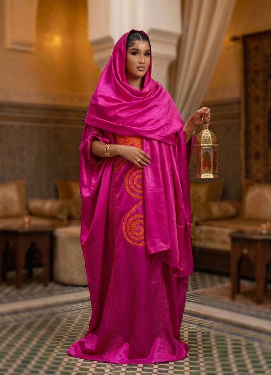 The Picanto Boubou is a standout kaftan made from luxurious liquid mikado, hand-stitched with vibrant orange embroidery for a refined, elevated finish. Designed with adjustable ropes that create a high-low hem and cinched waistline.