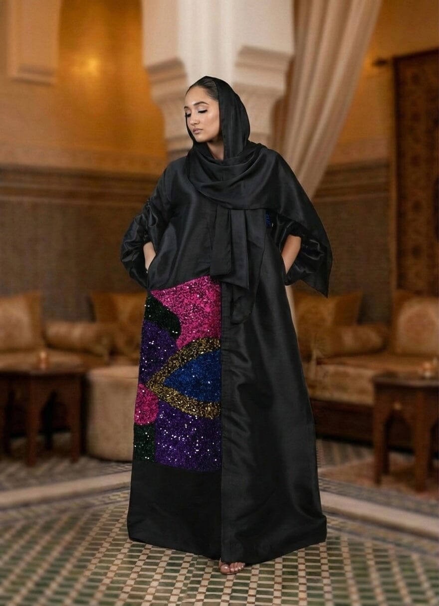 Introducing the Picasso duster Dress, a stunning wearable art piece crafted from premium Mikado Silk and adorned with vibrant multicolored sequin fabric, this design offers both luxury and versatility in one masterpiece.
